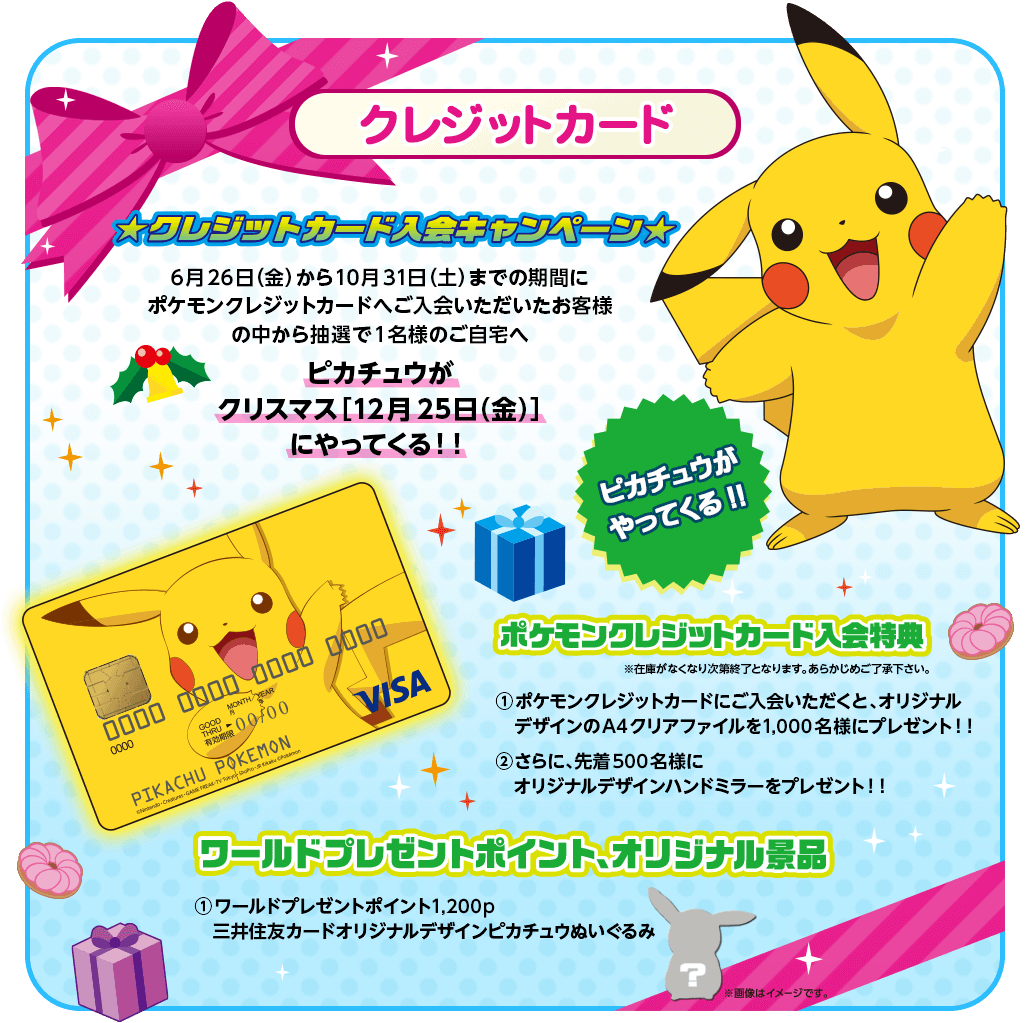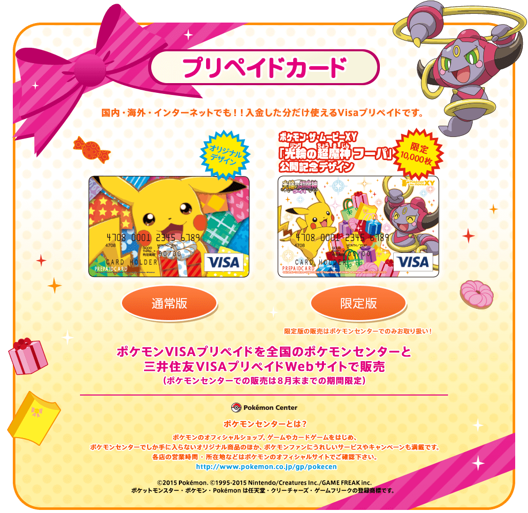 São três modelos: um cartão de crédito normal toda amarelo com o Pikachu e outros dois pré-pagos, um com o Pikachu rodeado de presentes e outro com o Pikachu e o Hoopa. Vejam: