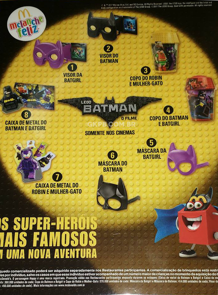 O McDonalds vem caprichando nos brindes do McLanche Feliz, como brindes do Super Mario, Mario Kart, Pokémon e Hora da Aventura, por exemplo. Dessa vez os brindes não serão bonequinhos, mas sim itens inspirados no filme de animação LEGO Batman. Os brindes serão copos, máscaras e caixinhas.
