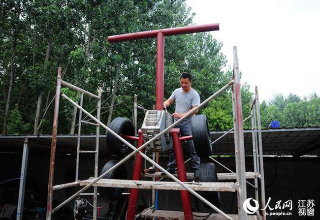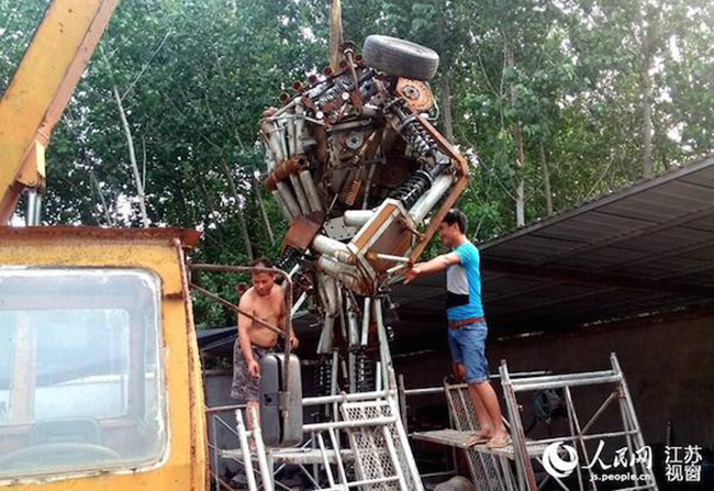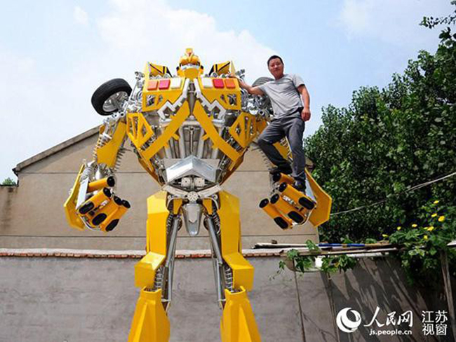 Para construir esse transformer de 5 metros de altura por 3 de largura e aproximadamente 3 toneladas, Wang usou peças de carros que conseguiu em um ferro velho. O robô gigante levou um ano para ficar pronto, confira as imagens: